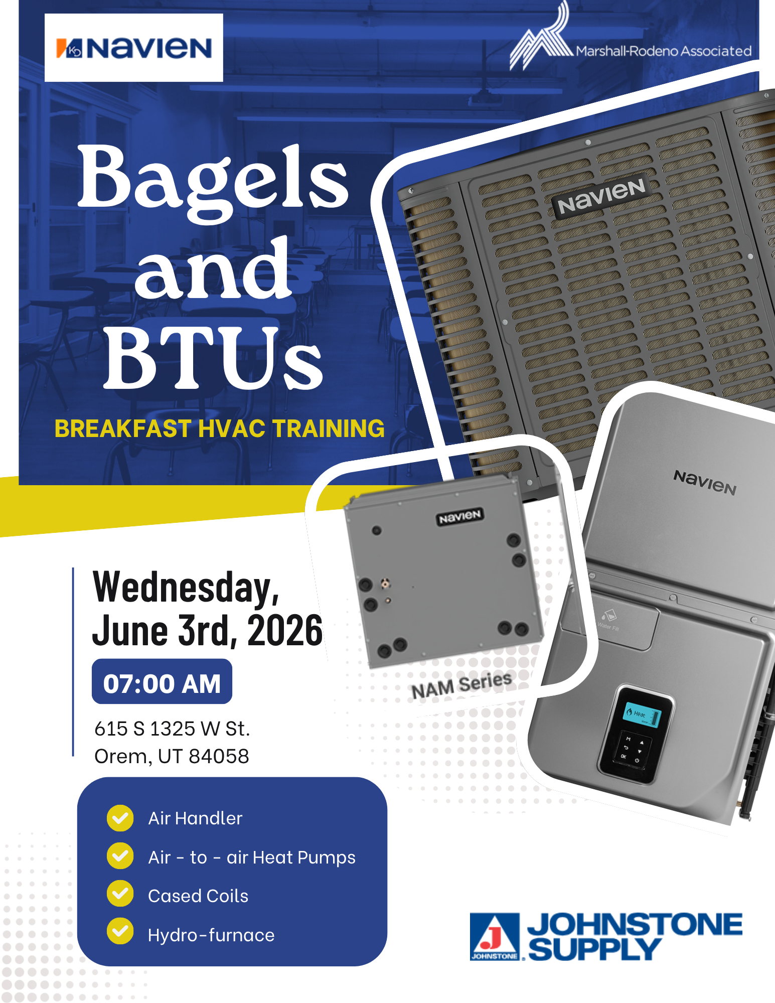 Bagels and BTUs Wednesday, June 3, 2026 7:00 AM 10:00 AM Johnstone Supply - Orem 615 South 1325 West Street Orem, UT, 84058 United States (map) Google Calendar ICS