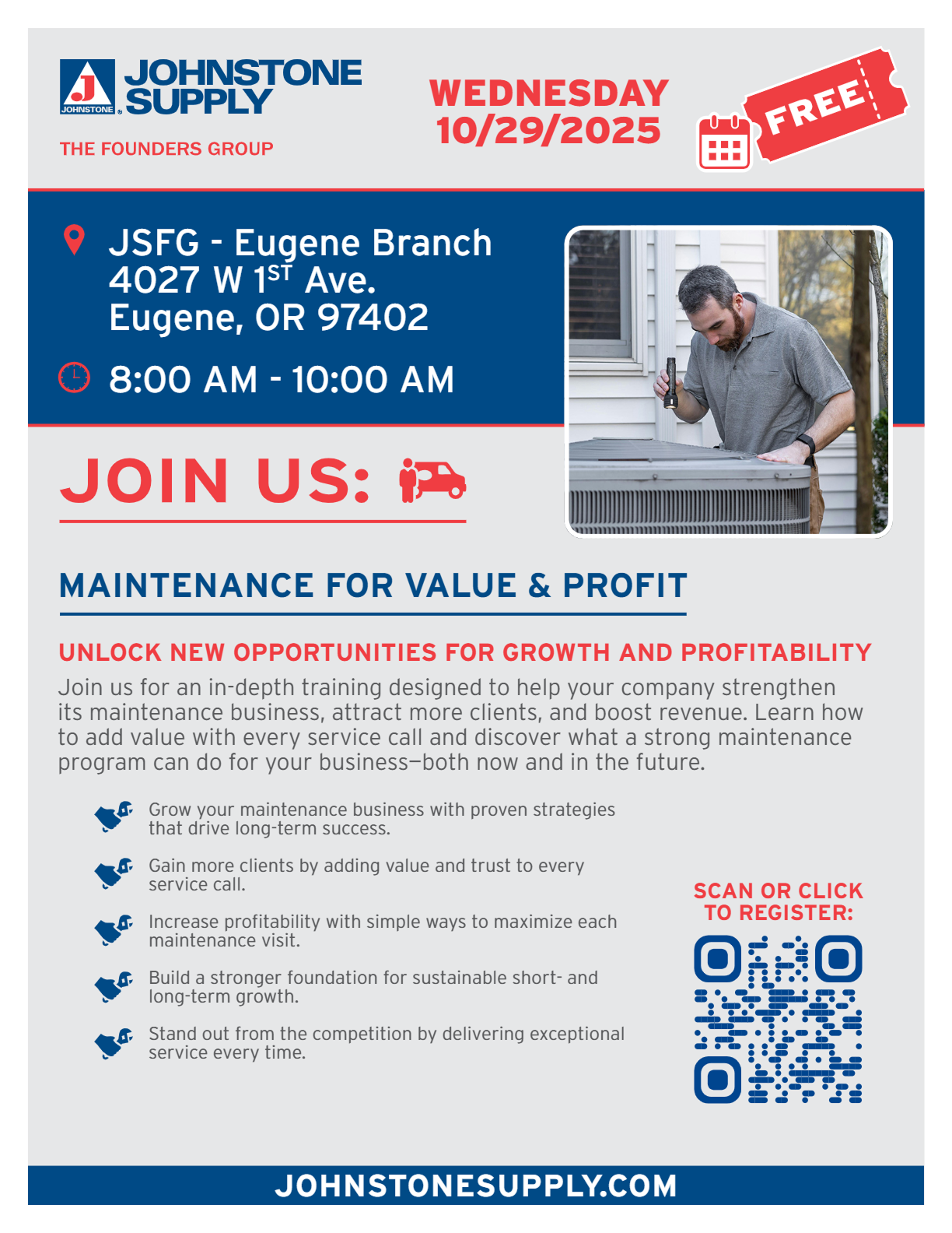 Eugene: Maintenance For Value and Profit Wednesday, October 29, 2025 8:00 AM 10:00 AM Johnstone Supply Eugene 4027 West 1st Avenue Eugene, OR, 97402 United States (map) Google Calendar ICS Click here to register